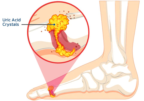A gota (artrite metabólica) é causada pelo aumento da biossíntese com aparecimento, produção excessiva de ácido úrico ou má secreção de ácido úrico, o que leva ao aumento do ácido úrico no sangue e, portanto, causa gota, que é caracterizada por hiperuricemia e episódios repetidos de artrite aguda por ácido úrico, que geralmente ocorre nas articulações do dedão do pé, mas também nas mãos, joelhos, cotovelos, etc.