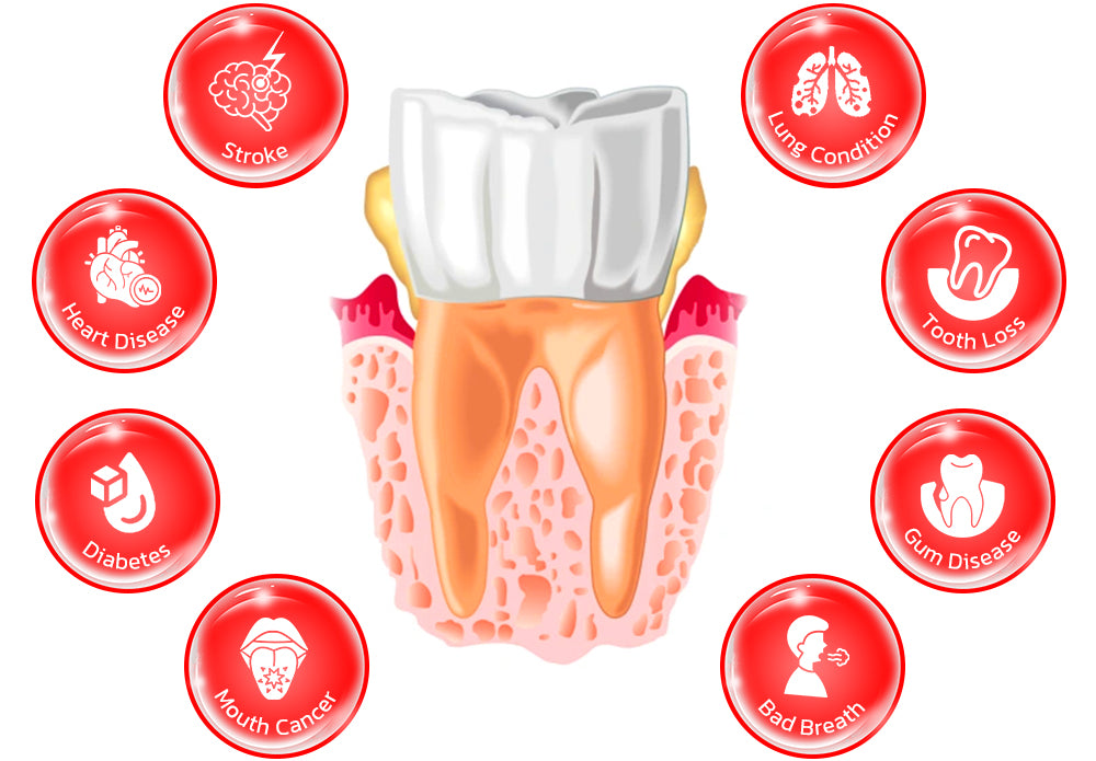 Zlé zdravie zubov môže viesť k množstvu problémov. vrátane zápachu z úst. zápal ďasien. a zubný kaz. Keď zvyšky jedla v ústach podporujú množenie baktérií. vytvára prostredie pre vznik rôznych ústnych zdravotných problémov. Postup od zápachu z úst a zápalu ďasien k vážnejším stavom, ako je paradentóza a vypadávanie zubov, podčiarkuje dôležitosť udržiavania dobrej dentálnej hygieny. Zanedbanie zdravia ústnej dutiny môže spôsobiť, že baktérie erodujú ďasná. spôsobujú bolesť. a dokonca viesť k nezvratnému poškodeniu. zdôrazňujúc zásadnú úlohu preventívnych opatrení a pravidelnej starostlivosti o zuby pri predchádzaní týmto škodlivým následkom.