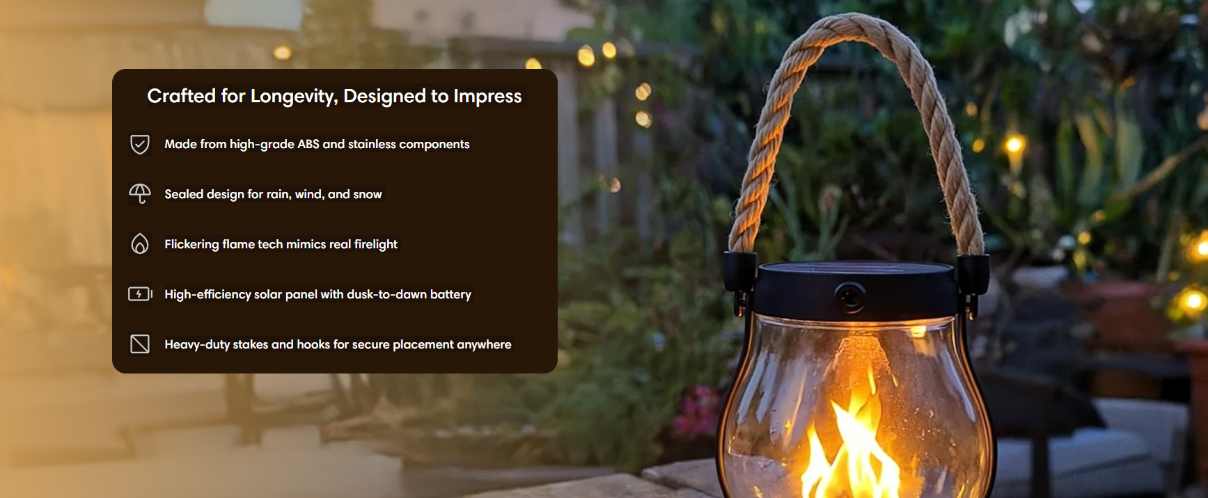 Esta lanterna solar cria um efeito de chama cintilante realista que confere ao seu espaço um brilho aconchegante e acolhedor — sem calor , fumaça ou perigo . Perfeita para jantares , pátios ou caminhos de jardim . Não é fogo. Mas seus olhos não notarão a diferença .