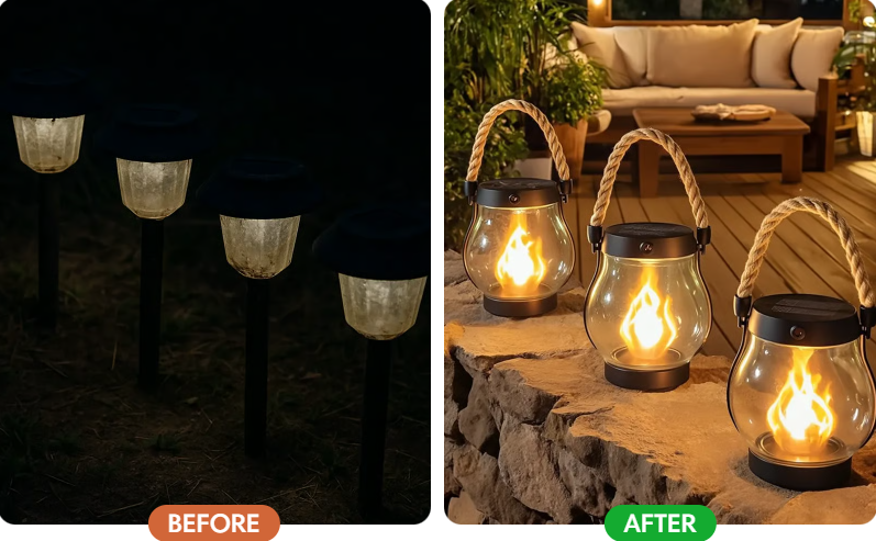 A maioria das luzes solares quase não brilha. As nossas criam calor, profundidade e atmosfera.